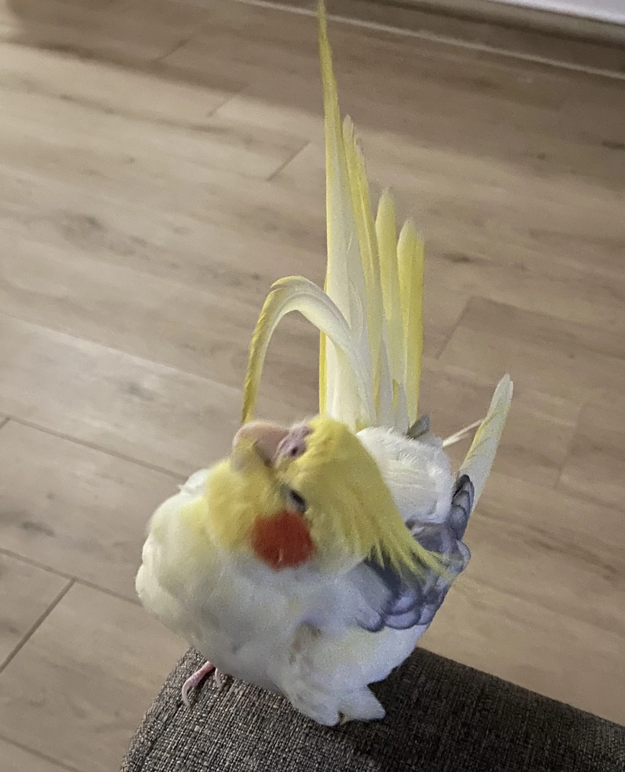 Lucky, petsitting client, preening his tailfeathers. Photo taken 12/16/2023